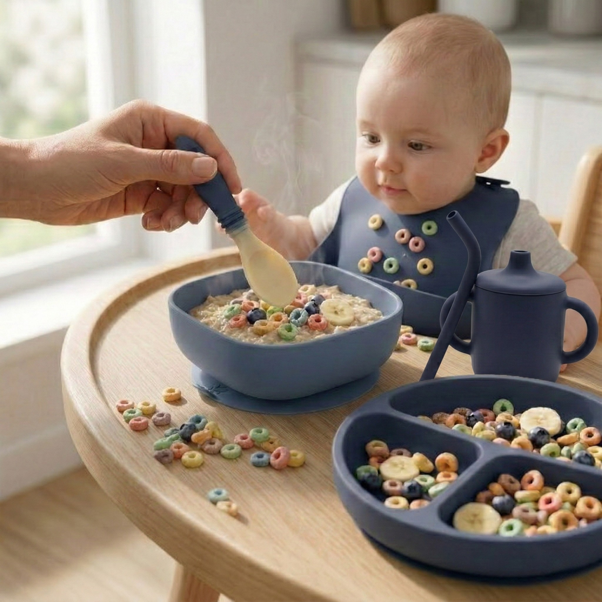 Babykins Suction Bowl & Bibs, Colour Changing Spoon, Divided Plate & Sippy Cup for Babies & Toddlers | 100% Food-Grade Silicone | Strong Suction Base | BPA-Free Baby Self-Feeding Plate Set for 6-24 Months Kids Dinnerware