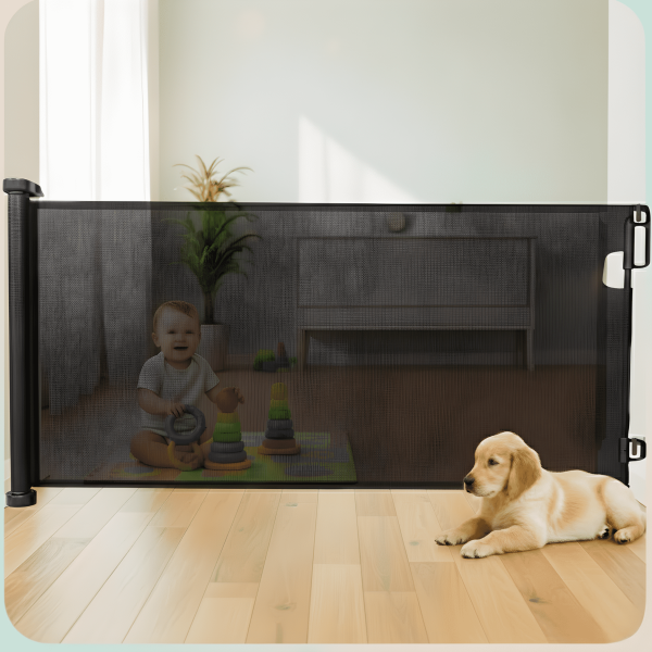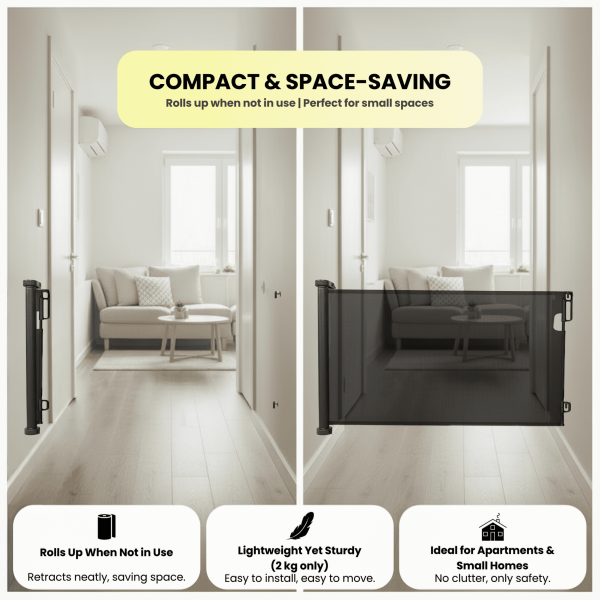 NO DRILING INSTALLATION: Retractable mesh gate can be installed anywhere indoors – perfect for kitchen, stairs, corridors, and doorways for enhanced child and pet safety