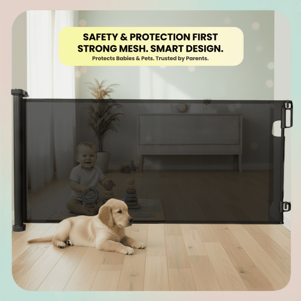 Babykins 6 to 36 months, 150L x 10B x 12H cm, Rectractable Mesh Safety Gate for Kids and Pets, No Drilling Insallation for easy and sturdy use (Black)