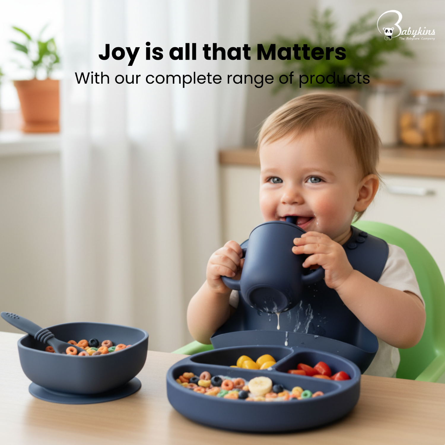 Babykins Suction Bowl & Bibs, Colour Changing Spoon, Divided Plate & Sippy Cup for Babies & Toddlers | 100% Food-Grade Silicone | Strong Suction Base | BPA-Free Baby Self-Feeding Plate Set for 6-24 Months Kids Dinnerware